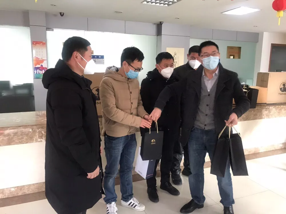 1月30日下午,小营辖区爱心企业杭州特美刻实业有限公司董事长徐荣培、浙江豪懿医疗投资有限公司总裁许旭宇慰问小营街道一线工作人员,分别赠送了一批慰问物资和防疫消毒液。